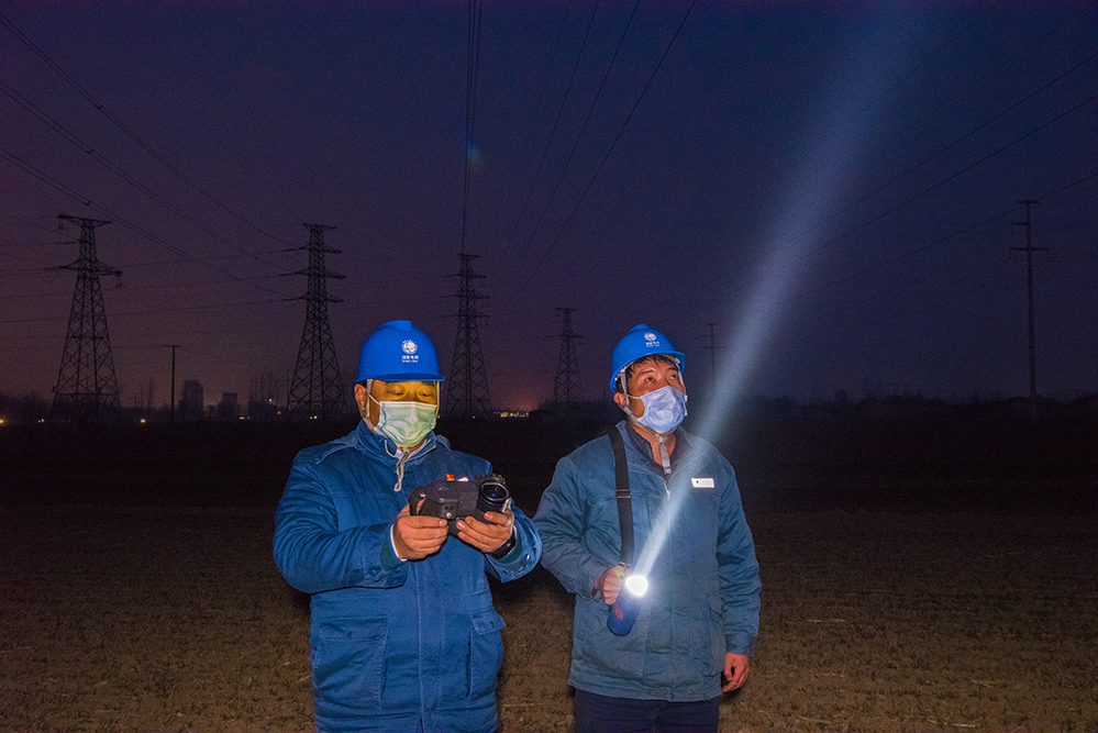 寒夜里,电力员工巡视测温线路设备,守护万家灯火的温暖与光明。