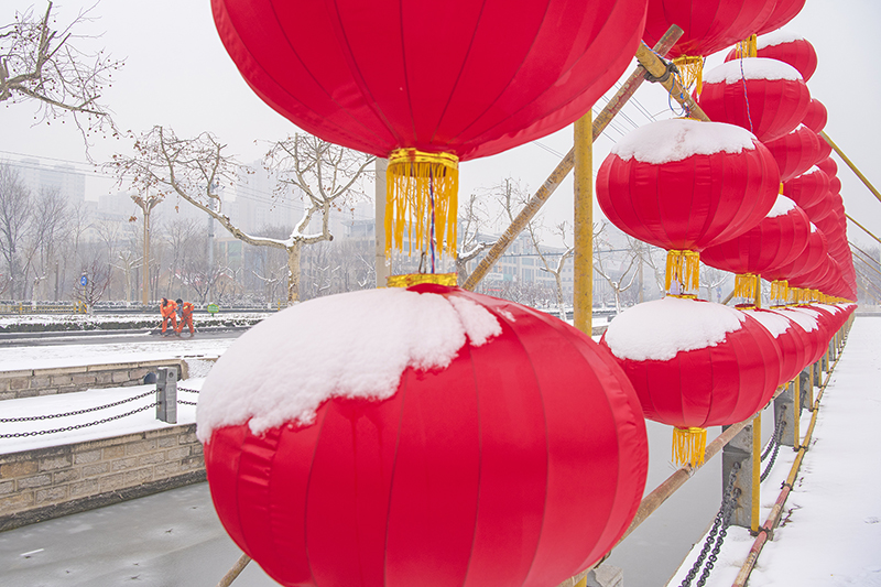 雪后,环卫工人立即开展道路积雪覆冰清除工作,保障行人安全出行。拍摄于济南市济阳区。