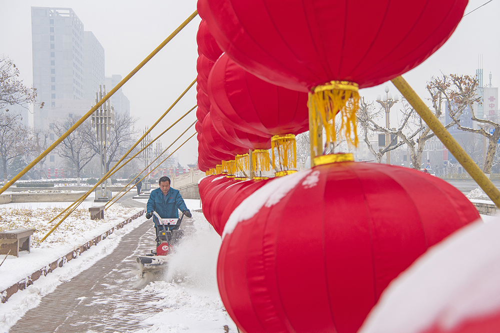 雪后,广场工作人员立即开展积雪覆冰清除工作,方便游玩人员行走通行。拍摄于济南市济阳区。