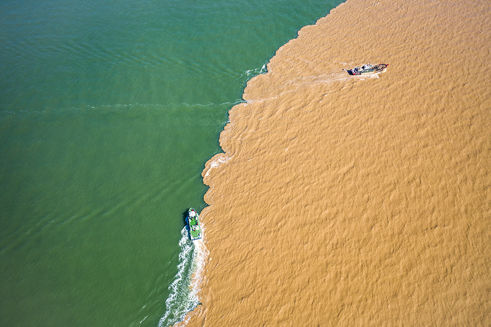 2021年10月23日拍摄的黄河入海口河海交汇、黄蓝共舞的自然景观。