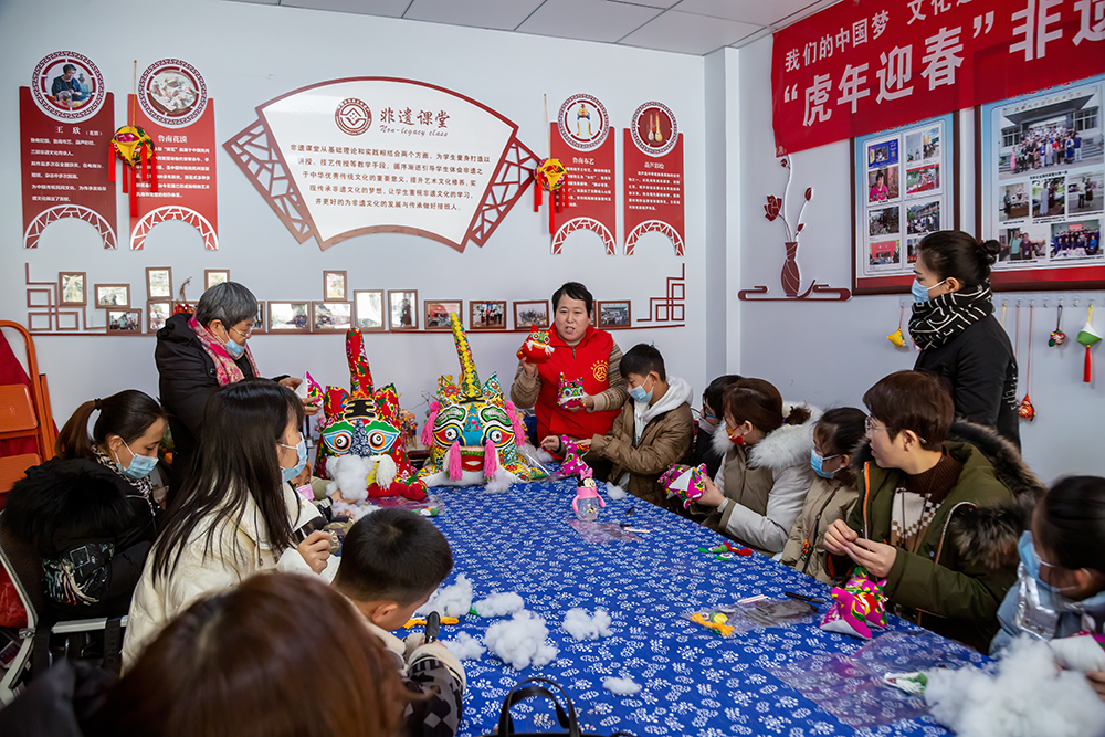 2022、01、26拍摄于枣庄市市中区王欣非遗工作室。枣庄市非遗传承人王欣正在向社区居民传授“鲁南布艺”制作技艺,带领大家缝制布老虎。既弘扬了我国优秀传统文化,又为迎接虎年的到来增添了欢乐气氛。