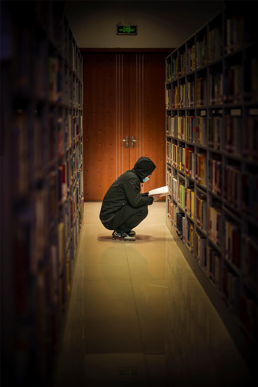情景是书籍,背景是门,主体是一人在蹲着读书,暗示书籍是成功之门。
