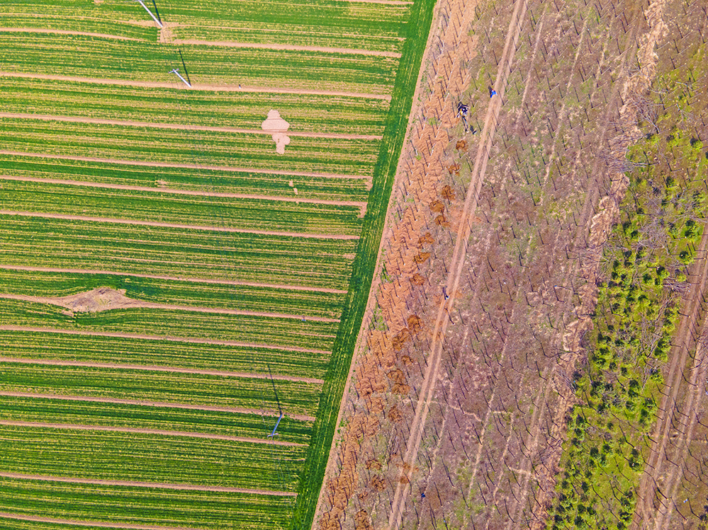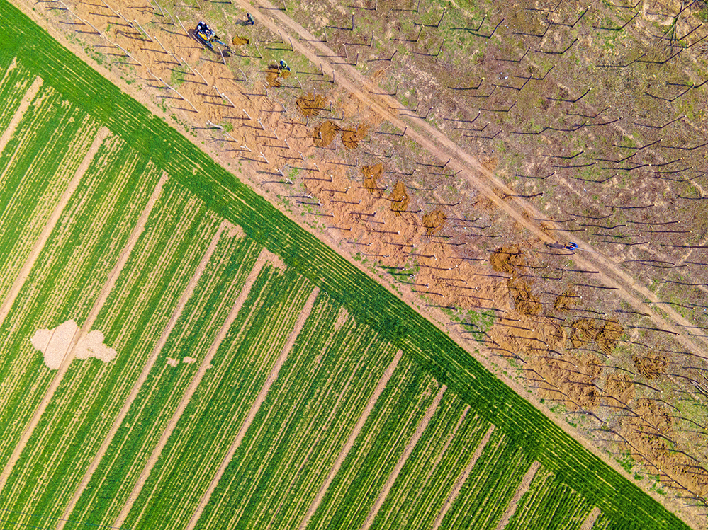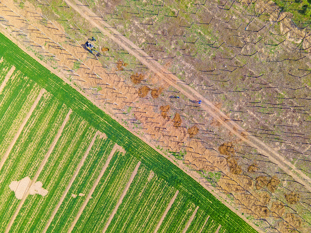 农户因地制宜地进行耕地和植树,发展特色农业。拍摄于济南市济阳区。