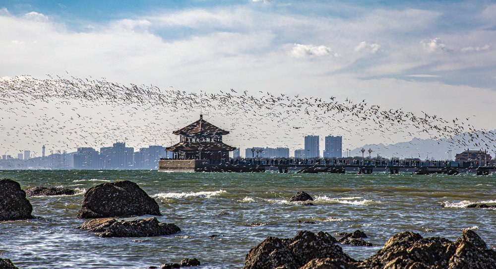 海鸥群翔舞似浪