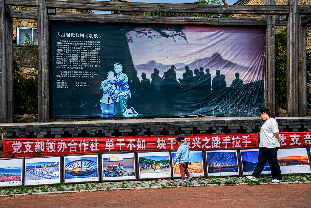 胶东育儿所田家村,战争年代300多名乳娘,不惜舍弃自己的亲生骨肉,抚养1200多名革命后代,她们用无私的行动,谱写了一曲感天动地的大爱之歌,乳娘精神在这里世代相传。如今的田家村,红色基因牢记在心,母爱文化发扬光大。乳娘村新的故事在讲述着......。这是村里举办摄影展,一对母子正在观展。2020年5月拍于乳山崖子镇田家村。