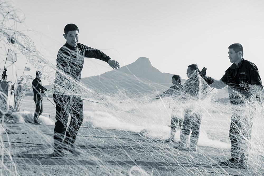 沿海的渔民们,以捕捞为生,每次出海回来,都要趁着休息时,抓紧时间修补网具,等待下一次的起航,小小银线承载着渔民的收获与希望。(拍于乳山市大乳山旅游风景区)