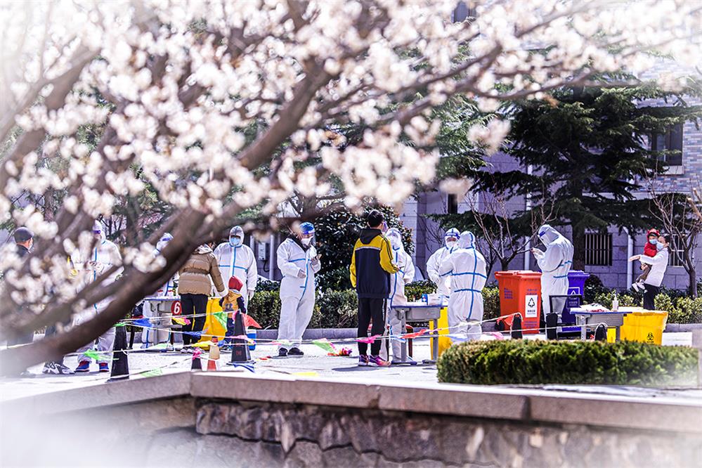 2022年4月拍摄于疫情期间小区内梨花下忙碌的核酸检测工作人员,梨花映衬下的白衣使者,景意春暖花开,洁白无暇。