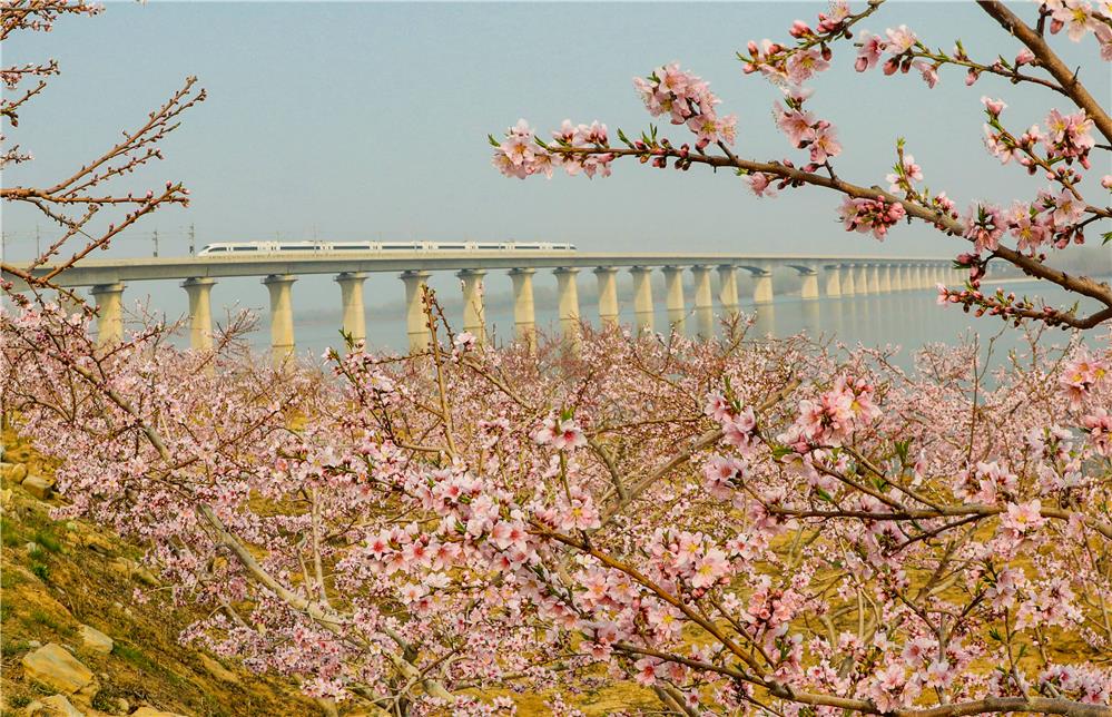 4月7日,一台动车在临沂市兰山区沂河特大桥上驶过。随着气温回暖,山东省临沂市沂河两岸桃花绽放,景色优美,蒙山沂水间散发着浓浓的春意。