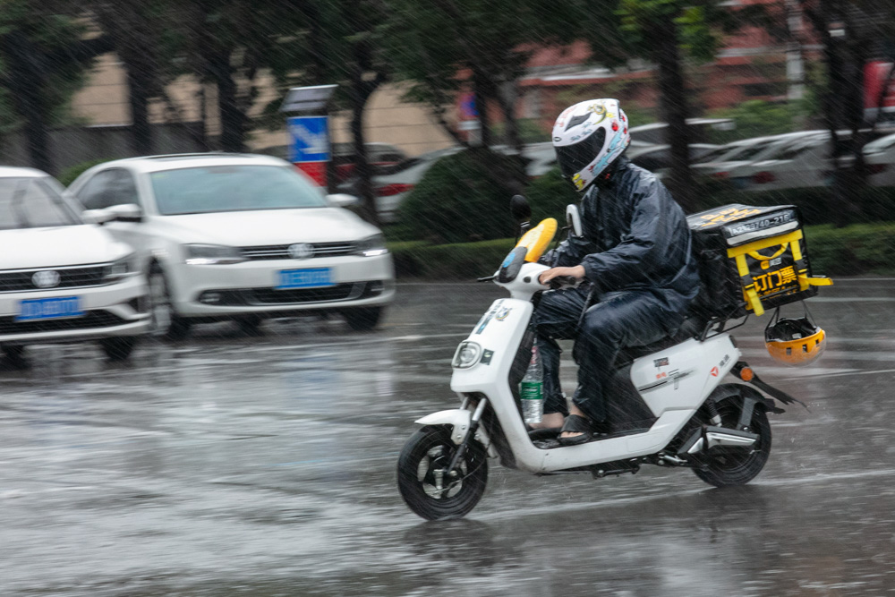 2021年7月28日,山东省滕州市善国中路,外卖送餐员雨中送餐。