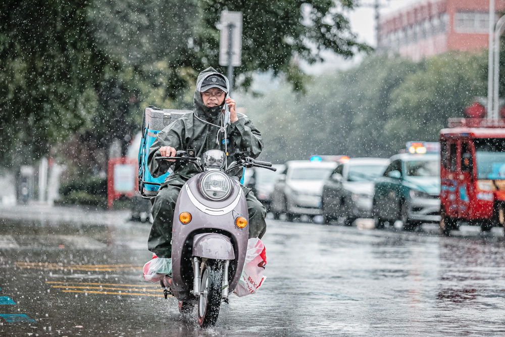 2021年7月28日,山东省滕州市善国中路,外卖送餐员骑行在雨中。