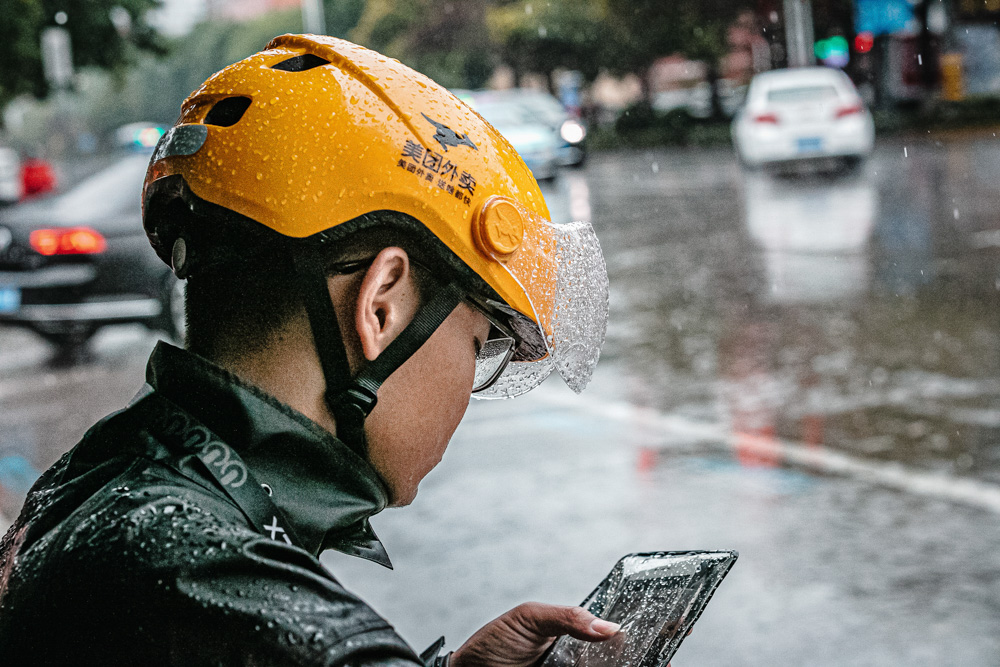 2021年7月28日,山东省滕州市善国中路,外卖送餐员雨中等红灯接单。