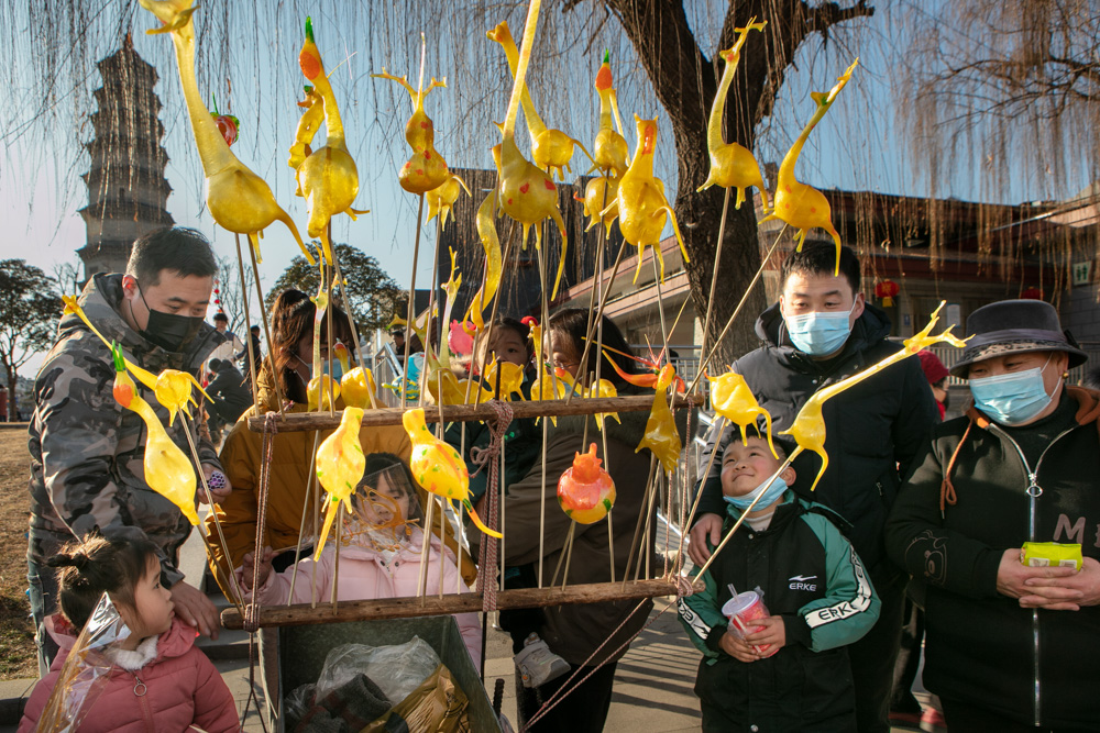 2022年2月1日,正月初一,山东省滕州市姜屯镇孔师傅在市龙泉广场上用传统非遗工艺吹糖人,吸引市民驻足观看购买。