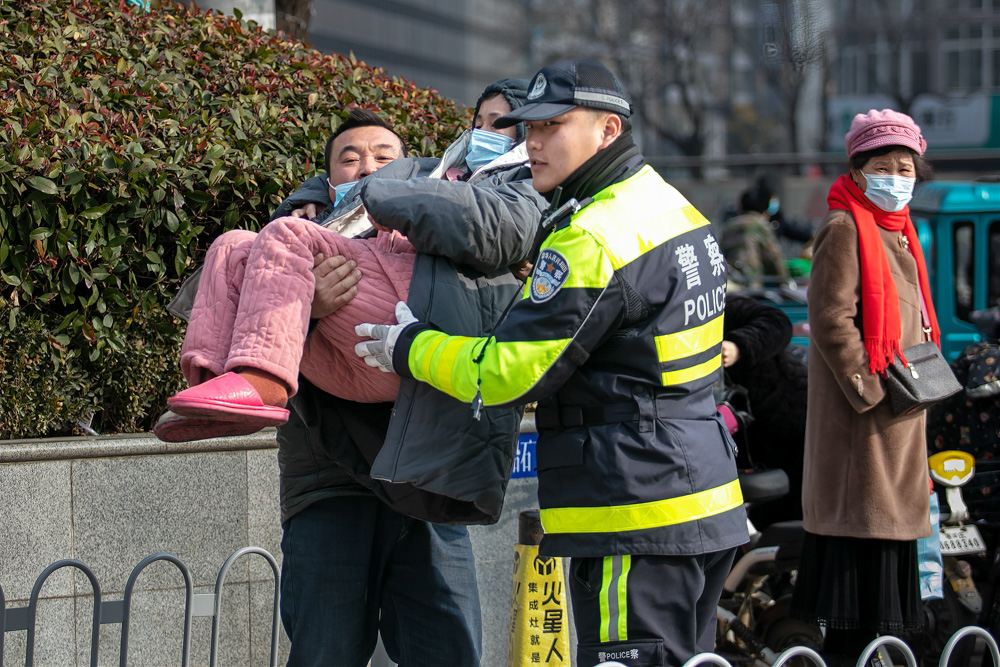 2022年2月11日,山东省滕州市公安局铁骑队员帮助市民就医。