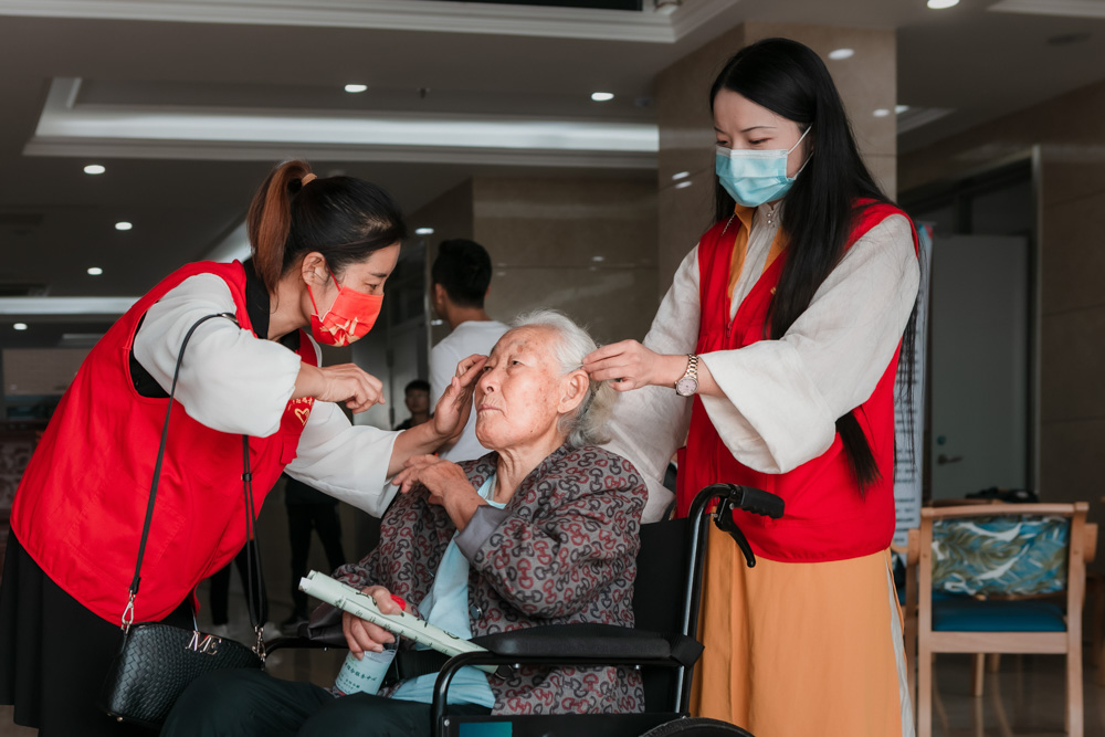 2021年10月14日,山东省滕州市志愿者在市养老综合服务中心帮助老年人整理头发。