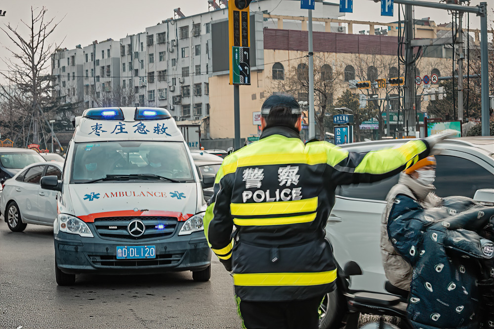 2022年2月11日,山东省滕州市公安局铁骑队员,疏导交通让路救护车通行。