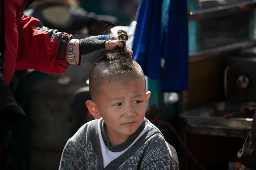 2020年3月4日,农历二月初二,山东省济宁市邹城市峄山庙会上,小市民刚剃的别具一格的发型。